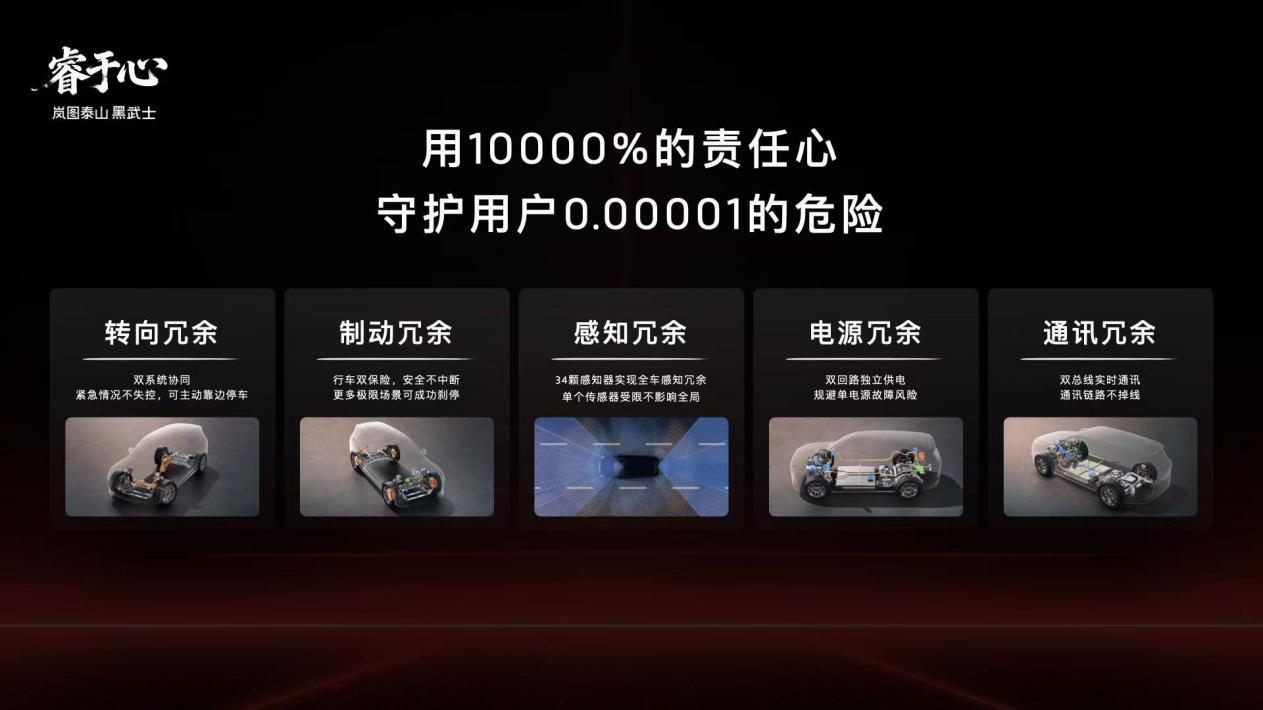 岚图泰山Ultra版基于具备L3技术能力的天元智能架构开发,深度融合岚图自主开发的青云行驶平台,采用五大安全冗余设计,涵盖转向、制动、感知、通讯、电源五大核心维度,通过多重备份机制降低故障风险,满足L3有条件自动驾驶的安全要求,为用户出行筑牢双重保障。央视直播测试显示,岚图泰山Ultra版遇到驾驶者失能、前车掉落障碍物、异物遮挡视线等危机场景,能在第一时间做出最正确的驾驶决策,避免事故发生。在悬空、极窄或有异形障碍物的车位中泊车,岚图泰山Ultra能精准识别周围环境,高效安全完成自动泊车。