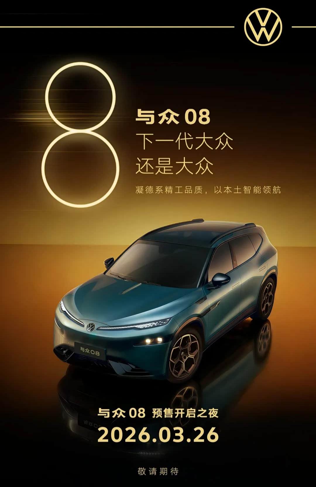 近日,大众汽车(安徽)宣布,大众与小鹏的首款合作车型——与众08将在3月26日开启预售。该车定位为纯电中大型SUV。