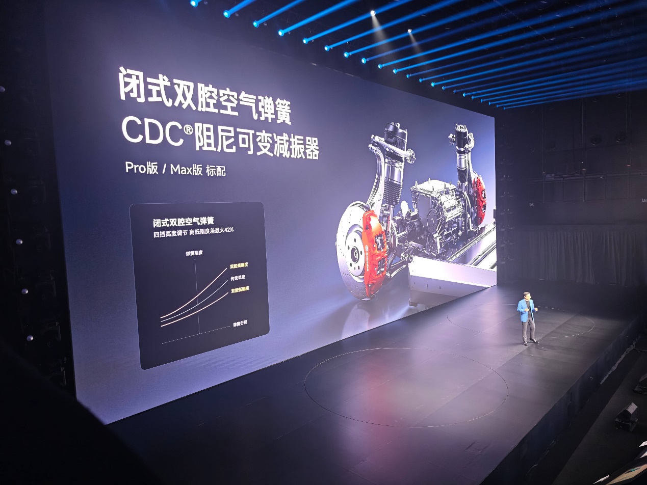 新一代SU7采用最新小米蛟龙底盘,全系搭载前双叉臂+后五连杆独立悬架,Pro版和Max版升级闭式双腔空簧和CDC阻尼可变减振器,配备全新防滑协同控制系统,系统响应速度提升四倍,车轮打滑量降低40%;升级更稳定的湿滑模式,湿滑路面稳定性提升30%。
