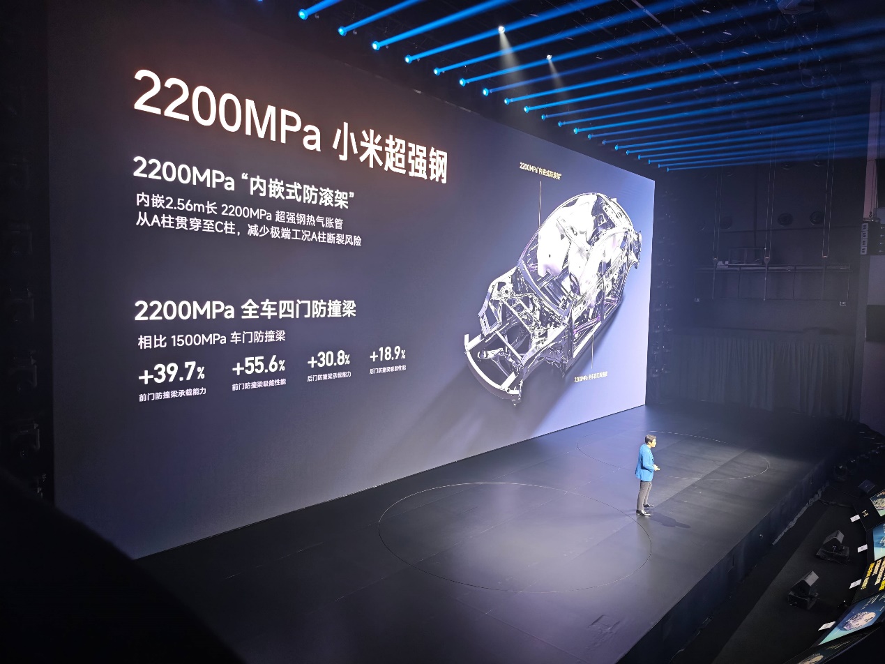 在整车安全上,新一代SU7全系升级“铠甲笼式钢铝混合车身”,高强钢和铝合金占比提升至90.3%;全车四门防撞梁和新增的“内嵌式防滚架”,均升级为2200MPa小米超强钢;全系标配9个安全气囊,新增2个后排侧气囊,更好保护后排乘客安全。