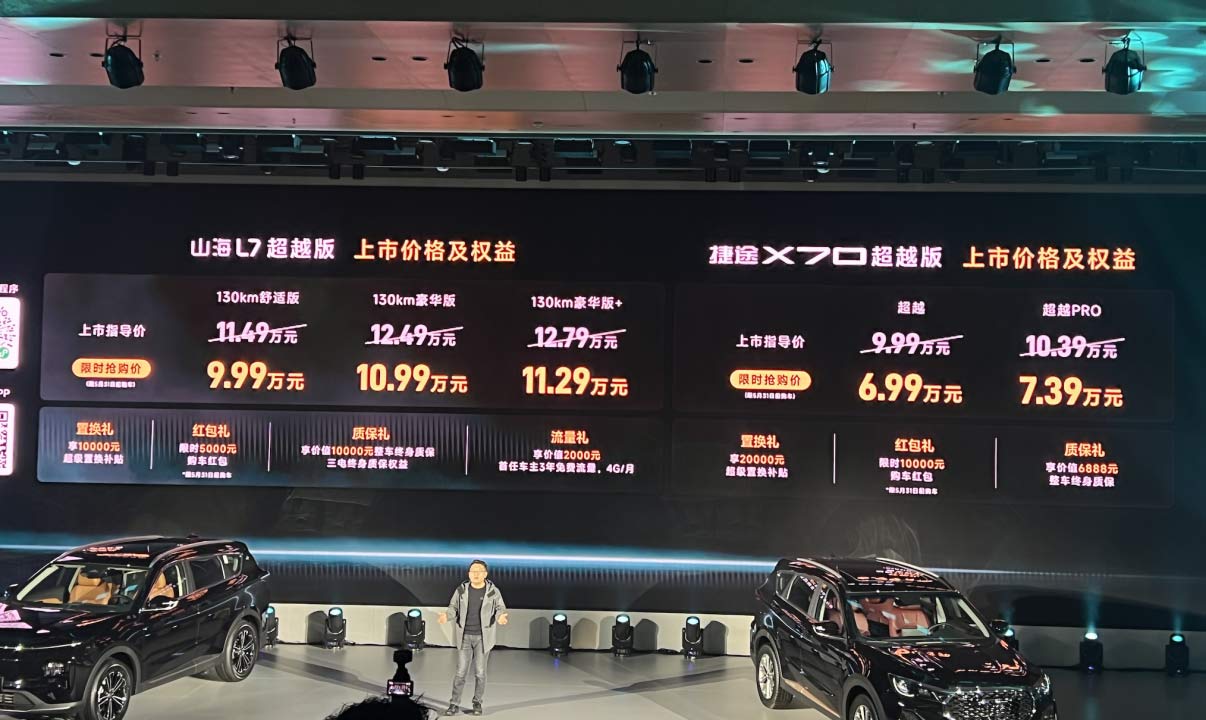 发布会现场,2026款捷途X70超越版的指导价及专属购车权益公布。2款车型指导价9.99万元-10.39万元,提供3重购车豪礼,限时抢购价6.99万元-7.39万元。