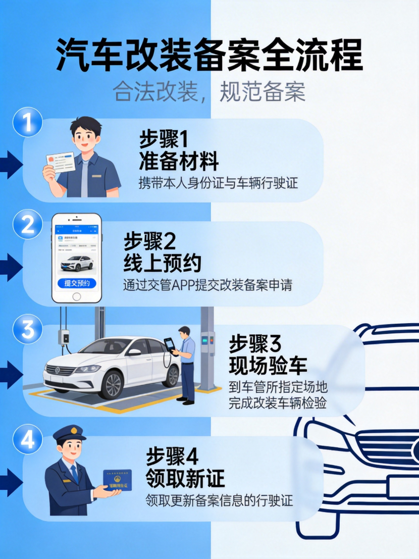 关键数据:踏板单侧外伸≤50mm;改色面积>30%需 10 日内备案;车顶行李架高度增加值≤300mm。备案流程与材料清单