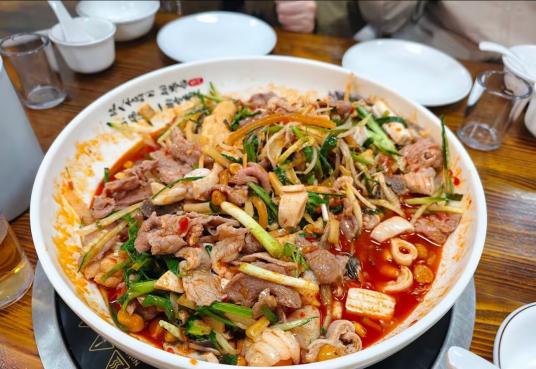 晚餐选在胜利烧烤城,牛杂锅咕嘟咕嘟冒着泡,豆腐泡吸满了汤汁,再配一盘炒螺蛳粉,人均90元吃到扶墙出。