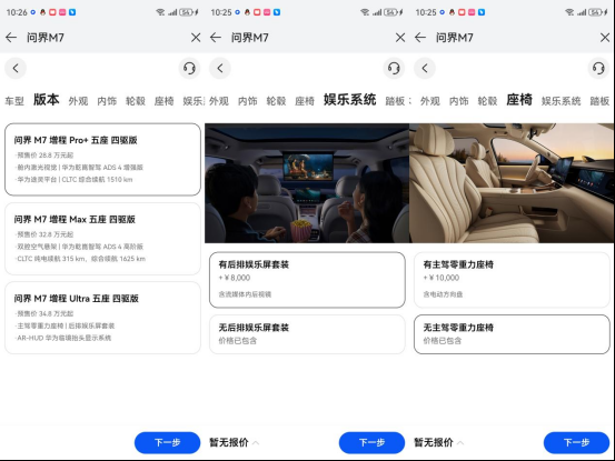 这次配置划分确实值得给个好评,在以往鸿蒙智行的车型上,一些座舱舒适性配置往往从中配车型才开始可选,而全新问界M7在低配的Pro+版本中便提供了主驾零重力座椅和后排娱乐屏套装可选,价格分别为10000元和8000元,选装完成后,冰箱彩电大沙发就一应俱全了,这无疑大幅提升了入门配置的竞争力。