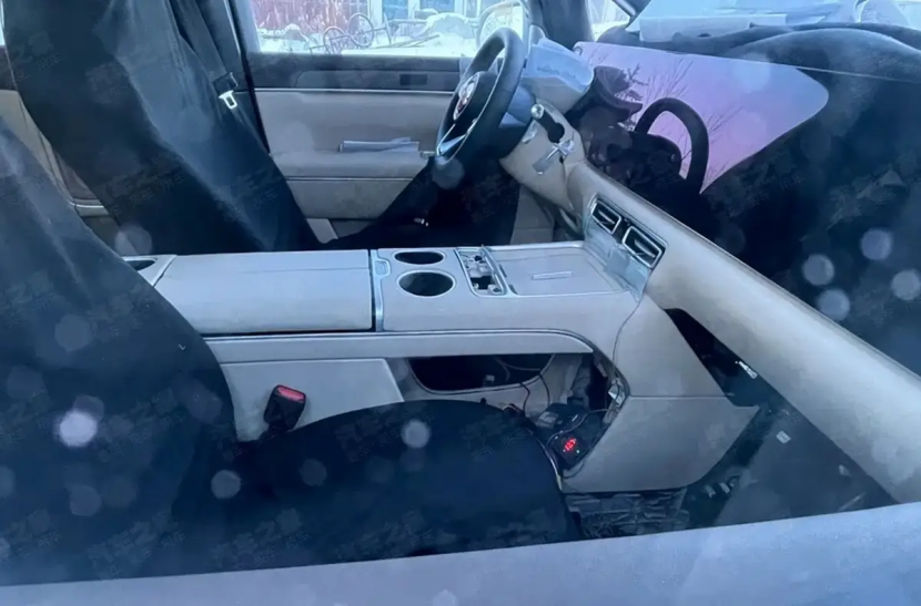 从谍照来看,智界V9前排配备了三连屏设计,屏幕边框有望进一步收窄以提升视觉观感。屏幕下方布局有横向空调出风口、手机无线充电面板以及部分物理按键。