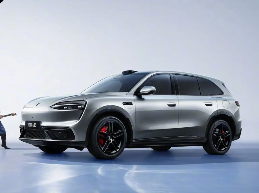 车身侧面,问界M6配备了双五辐亮黑色轮圈和红色刹车卡钳,进一步突出运动感。车门把手采用半隐藏式设计,兼顾实用与美观。车尾部分预计将采用贯穿式尾灯,并搭配尺寸较大的扰流板以及黑色防擦护板,使尾部层次更为分明。
