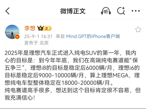 不过随着本月理想i8开始上量以及理想i6的上市,理想后续几个月应该会完成触底反弹,李想本人对此也充满信心,理想i8目标稳定月销6000,理想i6目标稳定月销9000到1000辆,争取纯电车型稳态在18000到20000辆每月,年底前高端纯电赛道“保五争三”。